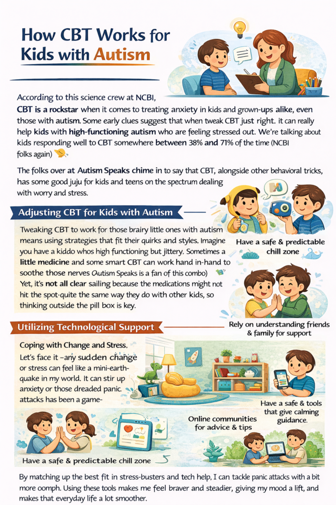 According to this science crew at NCBI, CBT is a rockstar when it comes to treating anxiety in kids and grown-ups alike, even those with autism. Some early clues suggest that when you tweak CBT just right, it can really help kids with high-functioning autism who are feeling stressed out. We’re talking about kids responding well to CBT somewhere between 38% and 71% of the time (NCBI folks again).