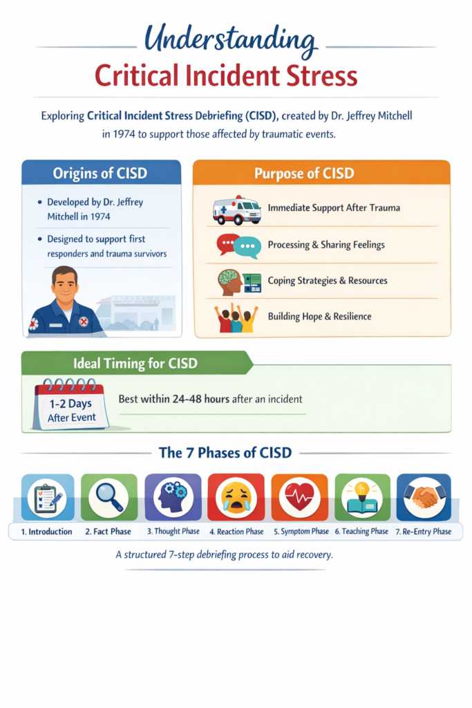 So, let’s chat about this thing called Critical Incident Stress and its management. A big part of getting a handle on it involves something known as Critical Incident Stress Debriefing (CISD). Back in 1974, Dr. Jeffrey Mitchell came up with CISD. Why? Well, his time as a paramedic and firefighter taught him that after dealing with really tough situations, folks often need a structured way to cope afterward. That’s where CISD steps in.