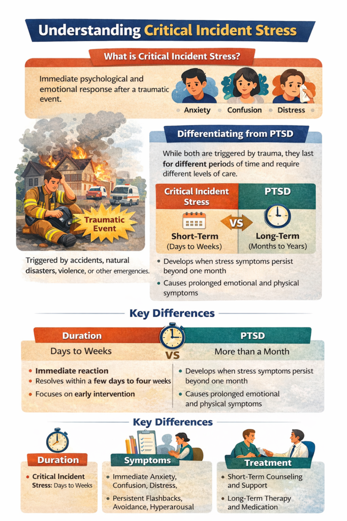 Now, here’s where things get a bit tricky. Critical incident stress isn’t the same as Post-Traumatic Stress Disorder (PTSD). Sure, they both rear their heads after something traumatic, but they hang around for different lengths of time. Critical incident stress is like a storm that clears up in a couple of days to four weeks, tackling those first gut reactions and stopping more trouble from brewing (OSHA).