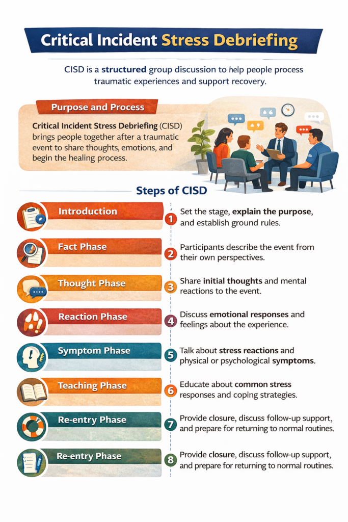Critical Incident Stress Debriefing (CISD) isn’t just a fancy term. It’s a way for people to come together after something traumatic and start sorting through their feelings. Picture it like a group chat where everyone can spill their thoughts, share emotions, and kick-start the path to feeling better (OSHA). It’s like a comforting circle where you can talk, listen, and heal, aiming to help folks bounce back stronger.