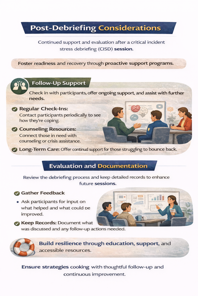 Once a Critical Incident Stress Debriefing (CISD) session is over, it’s time to check back in with those who took part. Think of it as touching base to see if everyone’s doing alright or if some may need a little more help. This could mean lending an ear or pointing them toward more resources if they’re feeling stuck. It’s crucial to remember that bouncing back emotionally can take time, and follow-ups show that we’re there for them for the long haul.