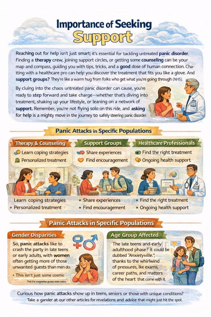 Reaching out for help isn’t just smart; it’s essential for tackling untreated panic disorder. Finding a therapy crew, joining support circles, or getting some counseling can be your map and compass, guiding you with tips, tricks, and a good dose of human connection. Chatting with a healthcare pro can help you discover the treatment that fits you like a glove. And support groups? They’re like a warm hug from folks who get what you’re going through (NHS).